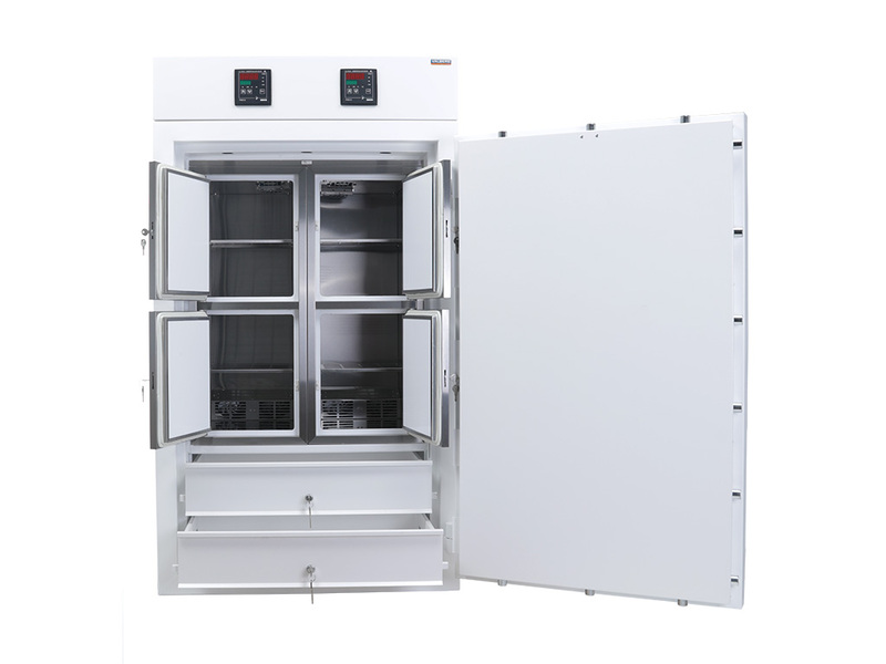 - Двумя выдвижными, индивидуально освещаемыми и запираемыми 32-ух литровыми ящиками без обеспечения тепловых режимов хранения